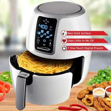 Use the powerful 1400 watt Brentwood 4-Quart Small Electric Air Fryer to fry foods to perfection quickly and evenly without the guilt of extra fat and calories. Use the powerful 1400 watt Brentwood 4-Quart Small Electric Air Fryer to fry foods to perfection quickly and evenly without the guilt of extra fat and calories. Our air fryer requires little to no oil to beautifully cook French fries, onion rings, chicken wings, steak, roasted veggies and more. Use the quick reference temperature guide and the 30 minute timer with auto shut off for fast, crispy results. Easily adjust the temperature between 170F to 400F. Cool touch, removable fry basket make serving easy. The frying pan and basket is made with a non-stick surface for effortless clean up.