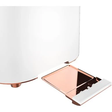 - Breakfast clean up gets a lot easier with a removable crumb tray in a copper finish