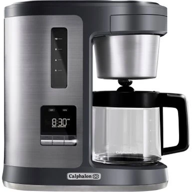Provide delicious beverages for everyone with this Calphalon Special Brew 10-cup coffee maker in dark stainless steel. The premium boiling system extracts up to 20 percent more flavor. The nonstick warming plate keeps the 10-cup glass carafe warm for up to four hours, and the Delay Brew feature lets you select a brewing time in advance. The strength flavor adjustment feature in this Calphalon Special Brew 10-cup coffee maker ensures the coffee is to your preferred taste.