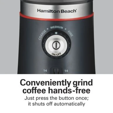 The Hamilton Beach Custom Grind Coffee Grinder lets you conveniently grind coffee hands-free, making it easy to enjoy the taste of freshly ground coffee every morning. The Hamilton Beach Custom Grind Coffee Grinder lets you conveniently grind coffee hands-free, making it easy to enjoy the taste of freshly ground coffee every morning. Just press the button once, and when the grinding is complete, the coffee grinder shuts off automatically. Whether you like your coffee finely or coarsely ground, simply turn the adjustable knob to choose your setting. Select from 5 settings, from coarse to medium to fine. Whether you’re grinding coffee for a quick cup or a full pot, we’ve got you covered with easy-to-select cup settings. Just move the lever up or down to select the number of cups you plan to brew. Choose 4 to 14 cups. With the durable stainless steel blades, this grinder efficiently grinds coffee and your favorite herbs and spices. Cleaning is easy with our dishwasher safe, removable grinding bowl designed with durable stainless steel. Because the bowl is removable, it’s also easy to fill with coffee beans and to pour ground coffee. Keep your countertop neat with the cord wrap underneath the base for adjusting the cord to the ideal length. Includes cleaning brush that stores in the back of the grinder.