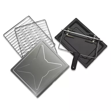 Powered by 1500 watts of power this countertop does everything and more. Perfect size for family meals fits a 5lb chicken two 12″ pizzas and more. Wide interior and 2 adjustable cooking racks. Convection bakes faster and more evenly than traditional ovens. 2 Hour timer and optional Stay On setting. Self-baste rotisserie with skewer revolves meat to lock in flavor while outside gets crispy. Dimensions: 13.11″H x 20.62″W x 16.54″D. Includes: Enamel coated bake pan/drip tray. Rotisserie skewer. Lifter.