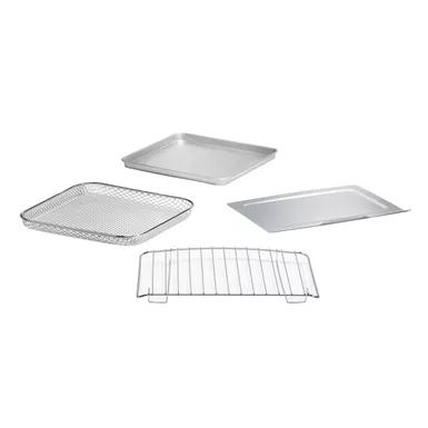 Sure-Crisp air fry circulates hot air around food for crispy meals. 4 Versatile cooking options: air frying toasting baking broiling. Fits 4 slices of toast 9″ pizza 3lb chicken or a 9″ x 5″ loaf pan. Use little to no oil for crispy fries delicious wings steaks and more. Accurate temperatures with range from 200F to 450F. Even cooking without the hot spots. Powered by 1500 watts. Stylish stainless steel exterior. Includes: Metal air fry basket. Bake pan. Broil rack.