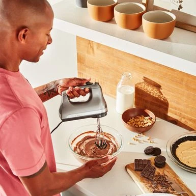 Compact, lightweight and great for your everyday mixing needs. This hand mixer features 6 speeds, 2 Flex Edge Beaters and the power and control to mix up your favorite cookie dough, mashed potatoes and so much more. Slowly stir in chunky ingredients, like nuts or chocolate chips, at speed one or whip egg whites or heavy cream at speed six. The Flex Edge Beaters deliver 2X the surface area for faster, more thorough mixing,* and also reduces the need to scrape down sides of the bowl, when compared to metal beaters. When you’re finished mixing, you can securely store your accessories with the integrated storage clip that attaches to the underside of your mixer, eliminating the need for bulky containers and/or storage boxes. *Compared to metal Turbo Beaterâ„¢ II accessories based on cake batter.