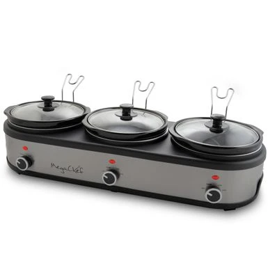 With the New MegaChef Triple 2.5 Quart Slow Cooker and Buffet Server in Brushed Silver and Black Finish with 3 Ceramic Cooking Pots and Removable Lid Rests will be your helping hand whenever you need to prepare multiple meals simultaneously without the With the New MegaChef Triple 2.5 Quart Slow Cooker and Buffet Server in Brushed Silver and Black Finish with 3 Ceramic Cooking Pots and Removable Lid Rests will be your helping hand whenever you need to prepare multiple meals simultaneously without the hustle and bustle of a restaurant kitchen! With this incredible kitchen tool, you will be able to not only cook 3 individual meals at the same time without having to monitor the stove, but you will also be able to keep those meals hot and serve them to your family and friends or guests and coworkers without breaking a sweat. This stunning slow cooker and buffer server features 3 Ceramic 2.5 Quart Cooking Pots with their own settings allowing you to control the heat level for each meal you cook. With the included detachable lid rests, your guests can easily serve themselves hassle free. Once you try serving meals with such ease it may be difficult to go without this unit again at any gathering!CUT YOUR COOKING TIME IN 3: Each of the 2.5 quart Ceramic Slow Cooker Pots is equipped with individual controls for your convenience. Allowing you to cook 3 individual dishes simultaneously! 3 SETTINGS PER EACH POT: Each Ceramic Slow Cooker Pots offers a LOW, HIGH and WARM Setting. Allowing you to not only cook 3 individual meals but keep them warm to be served to your family or guests!REMOVABLE LID RESTS: A convenient detachable lid rest is included for each of the Ceramic Slow Cooker Pots! Once you are ready to serve simply place the lids into their rests to allow easy access to the delicious meals you’ve prepared!ANTI SLIP FEET: This unit features anti slip rubber feet to ensure your Buffet Server Slow Cooker stays safely secure while you serve.CUT YOUR COOKING TIME IN 3: Each of the 2.5 quart Ceramic Slow Cooker Pots is equipped with individual controls for your convenience. Allowing you to cook 3 individual dishes simultaneously!3 SETTINGS PER EACH POT: Each Ceramic Slow Cooker Pots offers a LOW, HIGH and WARM Setting. Allowing you to not only cook 3 individual meals but keep them warm to be served to your family or guests!REMOVABLE LID RESTS: A convenient detachable lid rest is included for each of the Ceramic Slow Cooker Pots! Once you are ready to serve simply place the lids into their rests to allow easy access to the delicious meals you’ve prepared!ANTI SLIP FEET: This unit features anti slip rubber feet to ensure your Buffet Server Slow Cooker stays safely secure while you serve.1000 Watts x 3