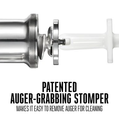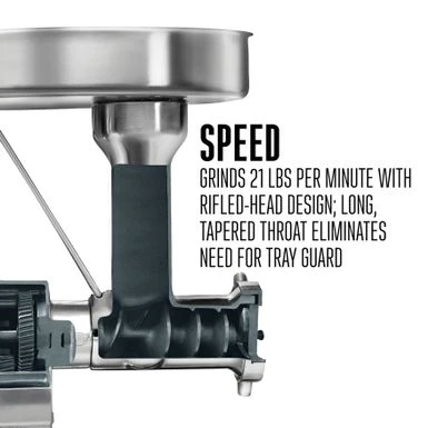 Grinding large volumes of meat fast is no problem with the Weston Butcher Series #32 Meat Grinder & Sausage Stuffer. This commercial-grade meat grinder has a powerful 1.5 hp, 1125 watt motor that is air cooled and permanently lubricated to continuously grind large volumes of meat without stopping. With a rifled-head design and tapered throat that eliminates the need for a tray guard, it grinds meat as fast as you can feed it up to 21 lbs. per minute. Grind all kinds of meat including beef, pork, venison, and bison. The forward-reverse mode is useful for grinding tougher meats and meats with connective tissue. Make fresh-ground hamburger, blend pork with other meats like venison for sausage, and grind meat for meatloaf, chili, and more. The grinder is engineered for quiet performance and rugged durability to process hundreds of pounds of meat. It includes a patented auger-grabbing stomper, coarse (7 mm) and fine (4.5 mm) stainless steel plates, a grinder knife, and a sausage stuffer kit with adapter spacer and four-sized funnels. The Weston Meat Grinder is ideal for hunters, farmers who raise animals for food, small retail butchers, and anyone who takes pride in a self-sustaining approach to food.Â